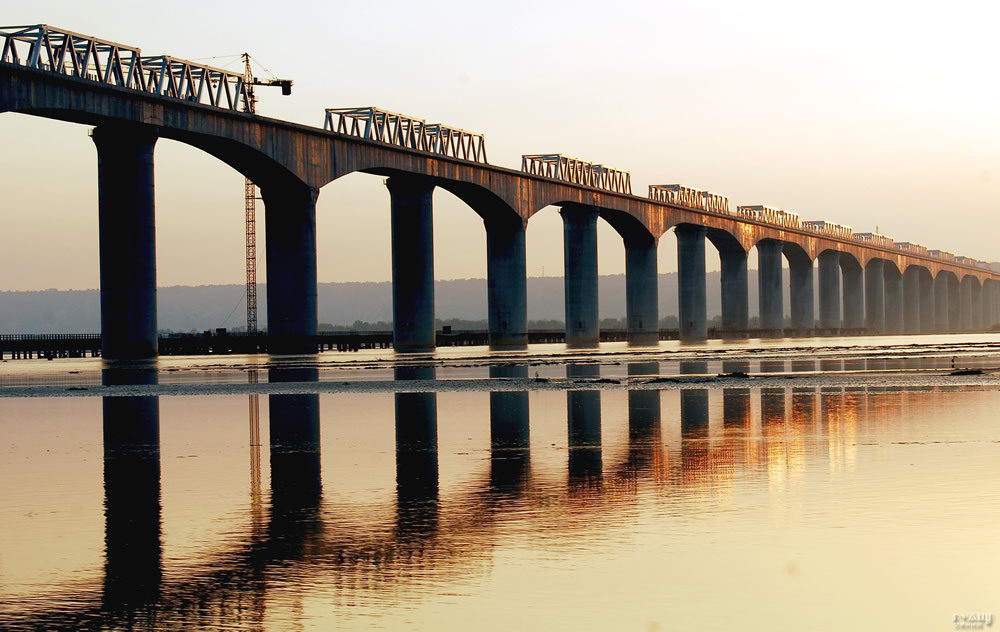 ] 2013年7月30日,大同到西安铁路客运专线晋陕黄河特大桥工程建设基本完成,2014年下半年通车,使黄河天堑变通途成为现实。图为桥、影、水及光混为一体,形成壮观的景色。