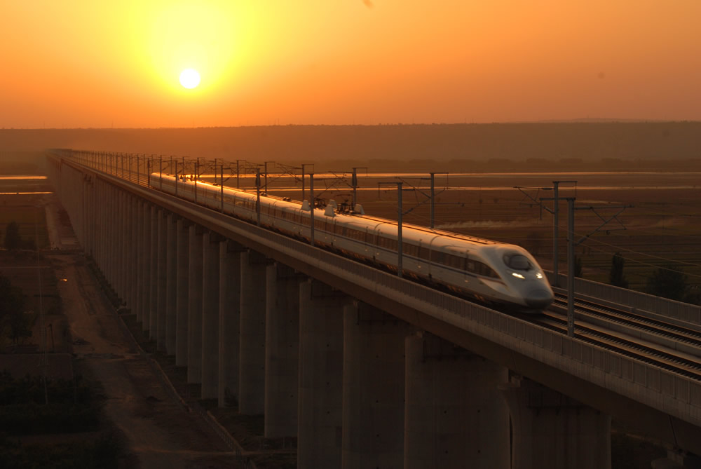 ] 2014年5月2日的傍晚,霞光下,一辆动检车飞奔在大同到西安高铁晋陕黄河特大桥上,为七月份通车开展联调联试工作。
