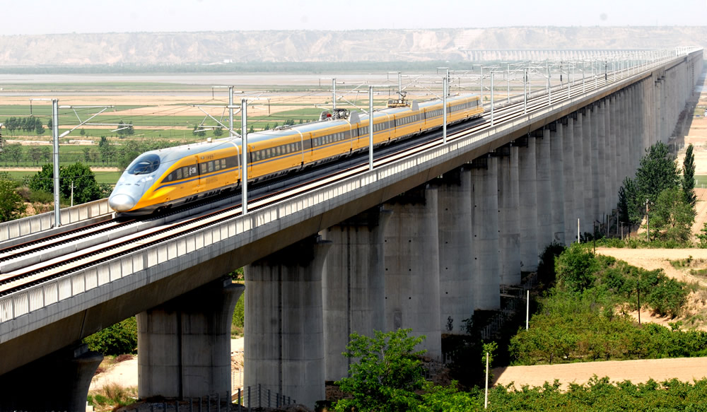 ] 2014年5月4日,一辆动检车飞奔在大同到西安高铁晋陕黄河特大桥上,为七月份通车开展联调联试工作。